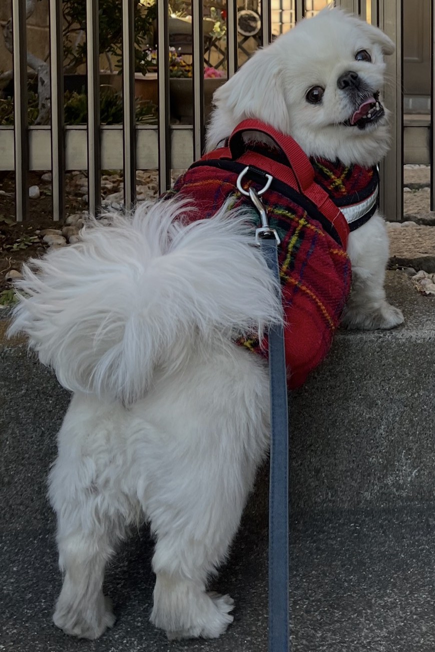 〈お散歩〉練習中。交通量の多い道路は少し苦手ですが上手に歩ける様になっています。落下物(石.煙草.うんち他)を時々咥える時があるので注意が必要です。