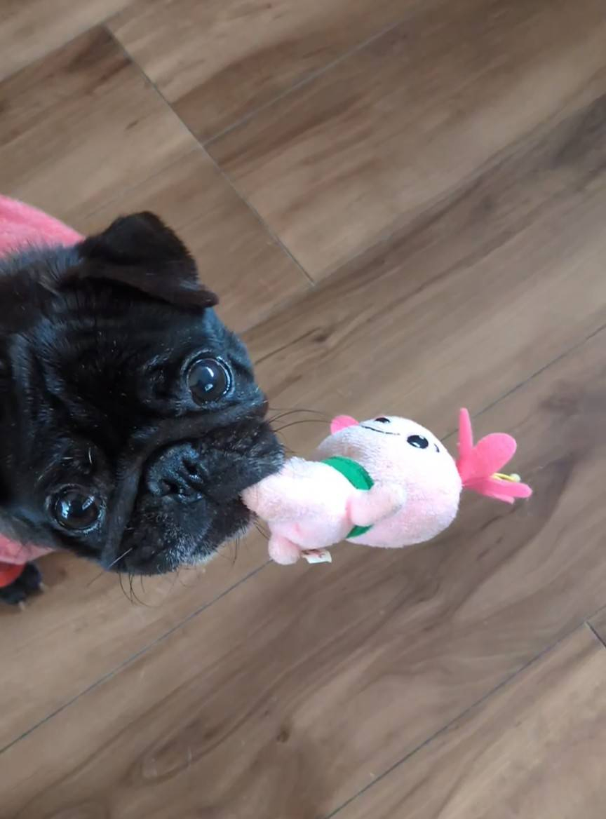 おっとりマイペース女子。食べる事とお昼寝が大好き。布やぬいぐるみをガジガジ噛むのも好きだが、人の手と遊ぶ方が好きで